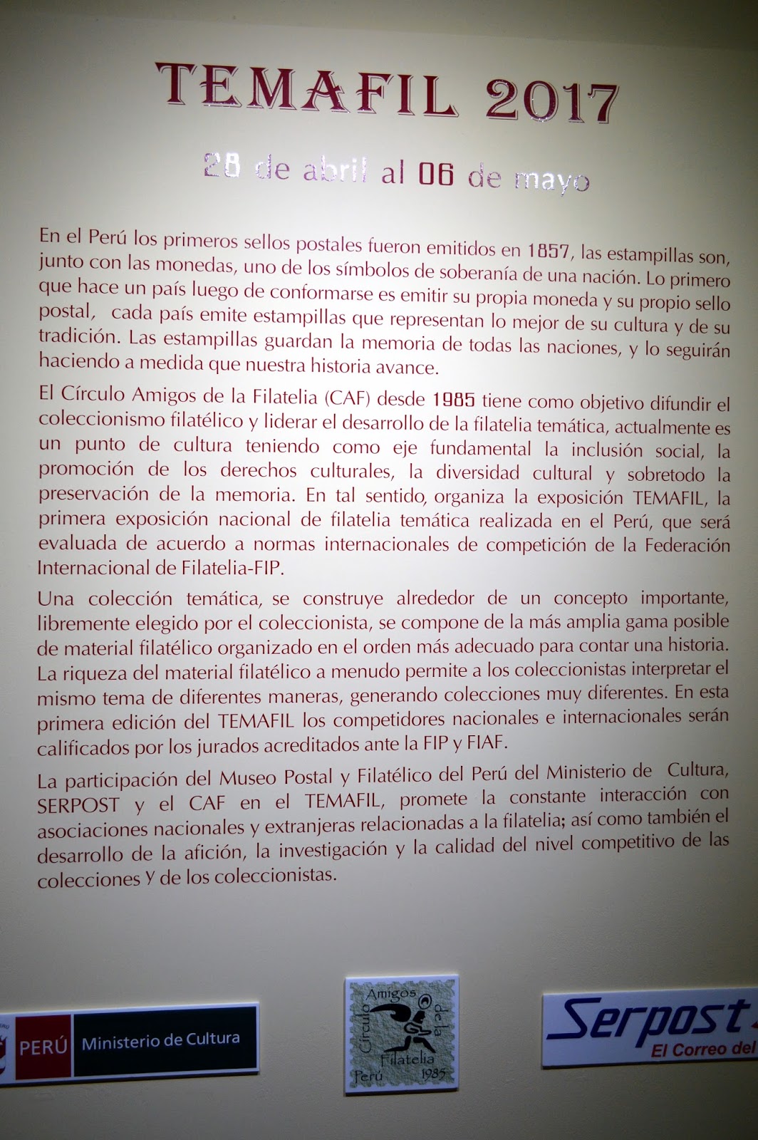 El Círculo Amigos de la Filatelia – CAF organizó la exposición #TEMAFIL del 28 de Abril al 6 de Mayo de 2017 en el Museo Postal y Filatélico del Perú ubicado en el Cercado de Lima. El CAF fundado en 1985 tiene como objetivo difundir el coleccionismo filatélico, actualmente es un Puntos de cultura del Ministerio de Cultura del Perú – Filatelia